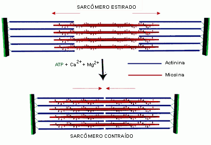 Na contração muscular, a actina desliza sobre os filamentos da miosina, que conservam seus comprimentos originais. A contração se inicia na faixa anisotrópica, ou A, onde a actina e a miosina se sobrepõem. Durante a contração, a faixa isotrópica (I) diminui de tamanho, enquanto os filamentos de actina penetram na faixa A. Concomitantemente, a faixa H, formada somente pelos filamento grossos (miosina) também se reduz, à medida que